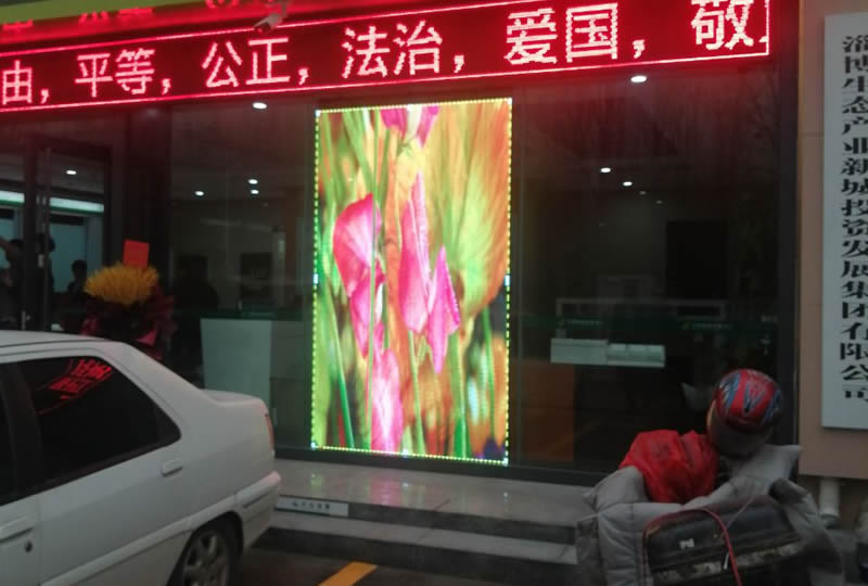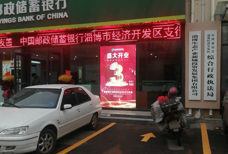 本案例中,维康国际为淄博市某邮政银行提高一套室内LED透明栅栏屏,如上图所示,外面显示清晰,从里面看半透明状态。