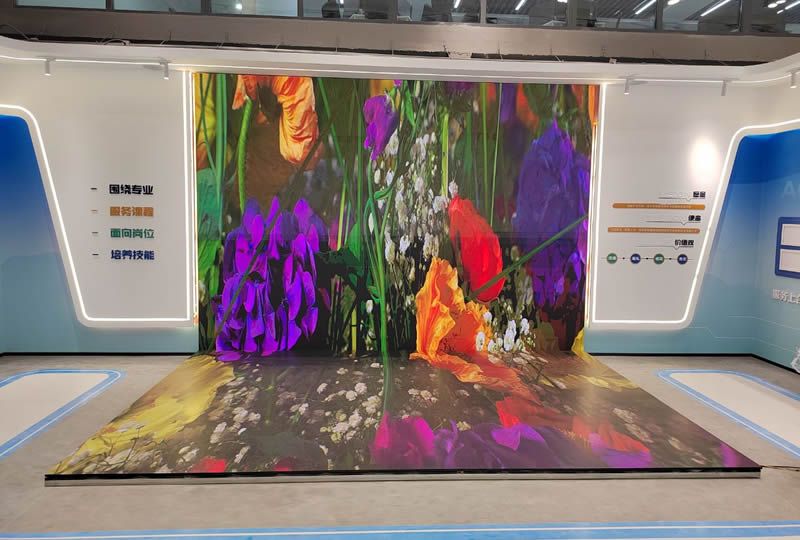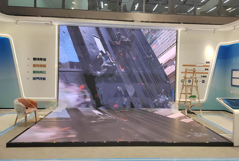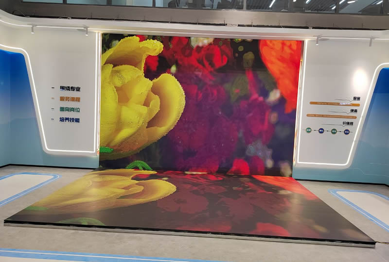 本案例中,维康国际为青岛市某企业展厅提供一套L型LED显示屏,如上图所示,地面与墙面形成90度角,大屏幕显示清晰,3D图像显示效果更好。