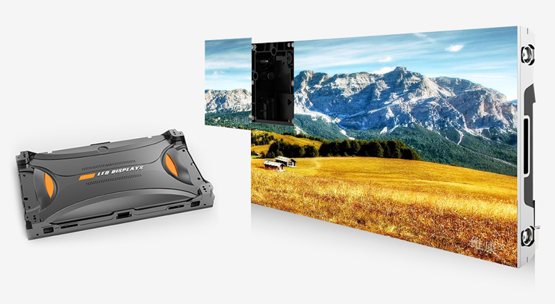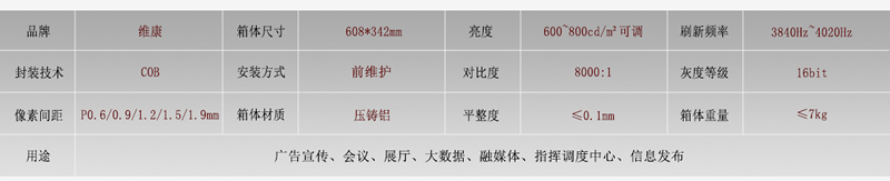 COB小间距LED显示屏采用压铸铝箱体式设计,箱体比例16:9,支持前维护安装。