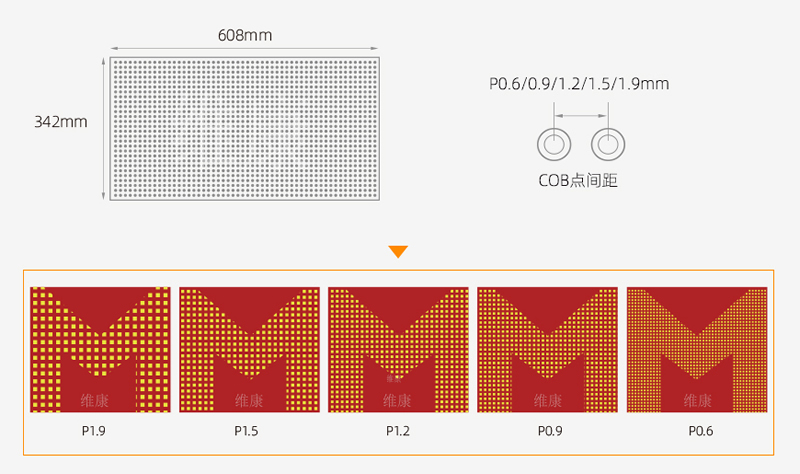 我公司提供5款COB小间距LED显示屏,分别是点间距为1.9mm、1.5mm、1.2mm、0.9mm、0.6mm。传统的SMD封装技术受制于焊接技术的原理,突破1mm以下的点间距变得非常困难,而且死灯率过高,而COB小间距LED显示屏不存在这一限制,通常点间距可以控制在0.6~2.0mm,能够做到传统LED小间距无法量产的P1.0以下的领域。