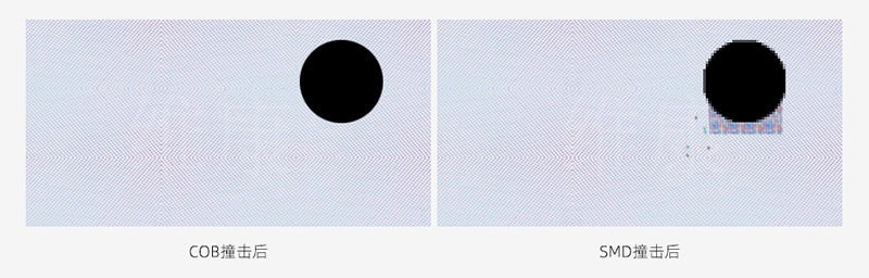 COB小间距LED显示屏由于是直接把芯片封装在了PCB基板上,在表面使用的环氧树脂封装,所以表面更加耐磨防撞,防尘防水,如下图所示,在受到撞击后,COB小间距LED显示屏不会掉灯,而传统的SMD表贴式LED屏则非常容易掉灯。