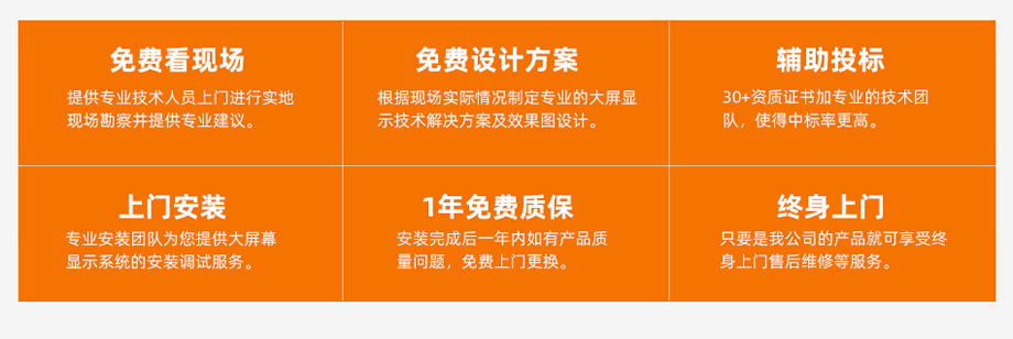 圆弧形LED显示屏的安装特别考验技术人员的实力,我公司针对这一点提供全国上门安装与调试,并且后期有售后问题还提供终身上门更换及检修服务,保证用户长久使用。