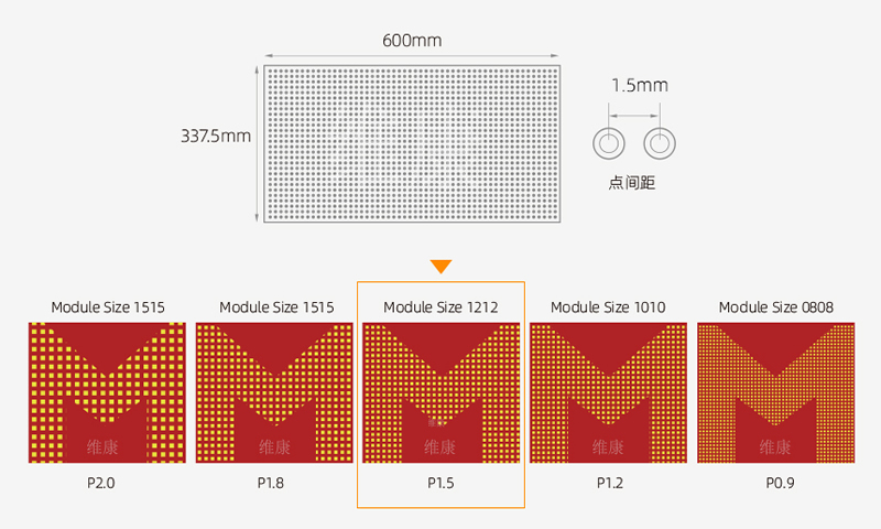 由于箱体是16:9比例,所以在拼接时只要保证等比例数量的拼接,整个LED显示屏就不会发生变形,从而保证整体的显示效果。如下图,P1.53小间距LED显示通过5*5拼接后即可达到一个1080P的分辨率效果。
