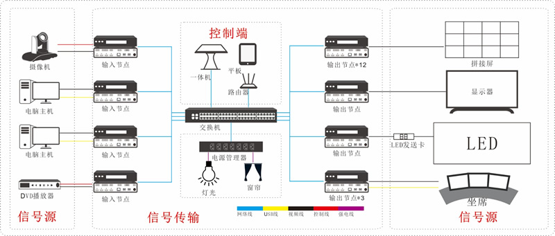 本方案采用可视化分布式拼接管理系统,支持不同信号源输入(HDMI/DVI/VGA/IP/Fiber),无缝切换,大屏拼接显示,KVM协作管理,可视化管理,POE供电,视频同步录制与播放,节点之间各系统的远程集中控制管理等功能。来完成整个系统的建设和设计。